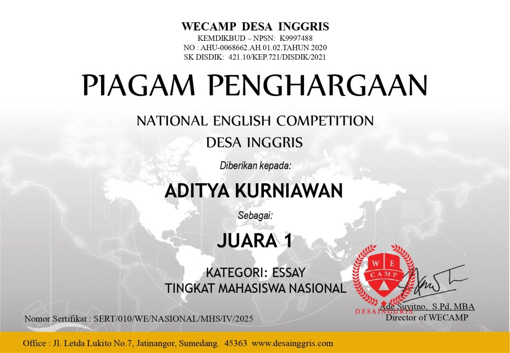 Aditya Kurniawan, kembali menorehkan prestasi membanggakan di tingkat nasional. Ia berhasil meraih Juara 1 dalam ajang National English Competition yang diselenggarakan oleh WECAMP Desa Inggris, lembaga pelatihan Bahasa Inggris yang telah terakreditasi oleh Kementerian Pendidikan, Kebudayaan, Riset, dan Teknologi.